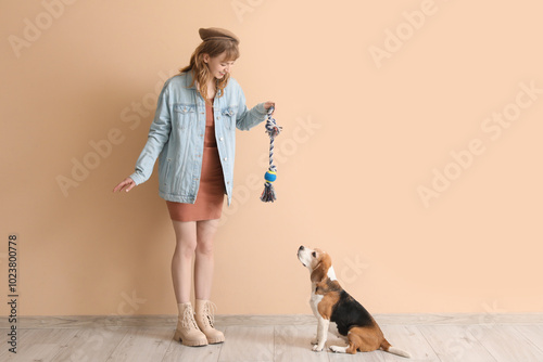 Obraz premium Young woman in casual attire playing with cute beagle dog on beige background
