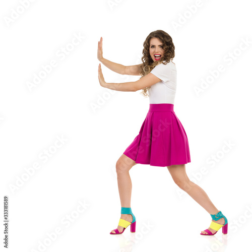 Fototapeta premium Young Woman In Colorful High Heels, Pink Mini Skirt And White Top Is Pushing...