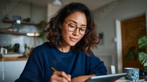 © iuricazac, Naklejka premium Young woman in eyeglasses working on laptop in kitchen.