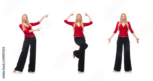 Fototapeta premium Young woman in flared pants isolated on white