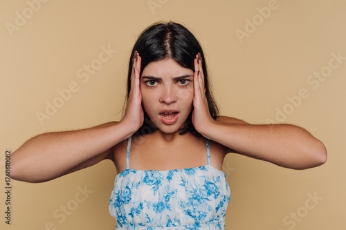 Fototapeta premium Young woman in floral dress holding her head in frustration.