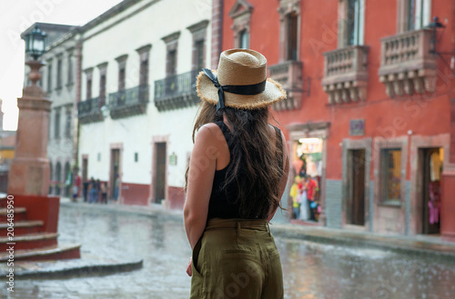 Obraz premium young woman in hat looking out onto street at town square in San Miguel de Allende, Mexico, during rain, with colonial buildings in background