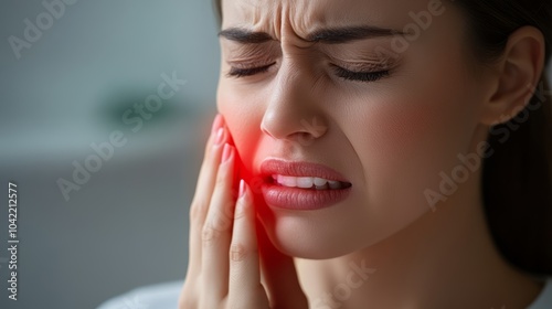 © olga_demina, Obraz premium Young woman in pain holding her jaw, emphasizing the need for dental care. She looks uncomfortable with a toothache and inflamed gums, highlighting oral hygiene importance