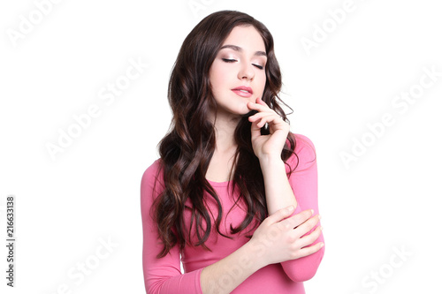 Fototapeta premium Young woman in pink dress on white background