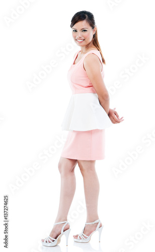 © iPortret, Naklejka premium Young woman in pink dress with hands behind back on white background