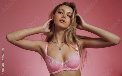 © Rgfx, Obraz premium young woman in pink lingerie, isolated over a pink studio
