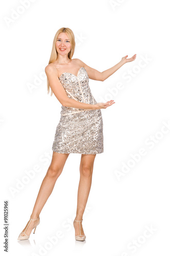 Fototapeta premium Young woman in silver dress isolated on white