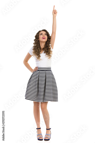 Fototapeta premium Young Woman In Striped Skirt Is Pointing And Looking Up