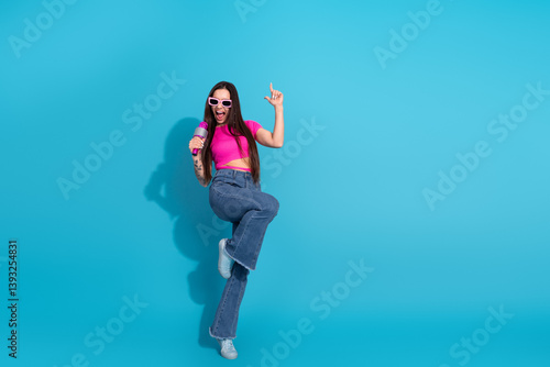 © deagreez, Obraz premium Young woman in stylish pink top and jeans posing joyfully with sunglasses on a bright blue background, expressing fun and trendy lifestyle.