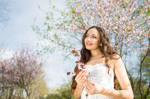 © Evgenia Tiplyashina, Fototapeta premium Young woman in the garden blooming in spring