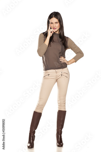 Fototapeta premium young woman in trousers and high boots posing on white background
