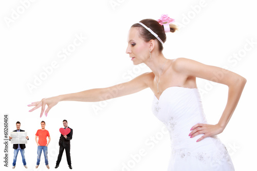 Fototapeta premium Young woman in wedding dress choosing candidate for husband
