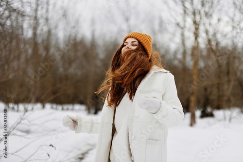 Obraz premium young woman in winter clothes in a hat fun winter landscape winter holidays