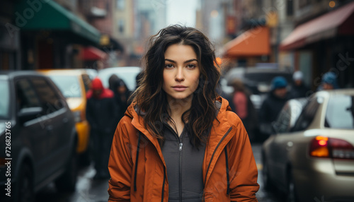 © Stockgiu, Fototapeta premium Young woman in winter coat walking in the rain, looking confident generated by AI