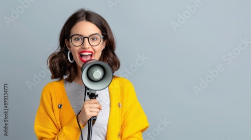 Fototapeta premium Young Woman in Yellow Cardigan Holding a Megaphone