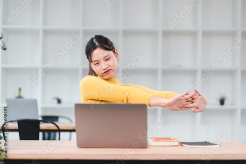 © kenchiro168, Obraz premium Young woman in yellow sweater stretches her arms while sitting at desk with laptop and notebooks, expressing tiredness or boredom in modern office setting