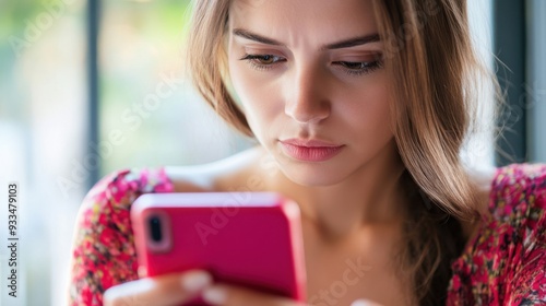 Fototapeta premium Young Woman Intently Scrolling Smartphone in Daylight