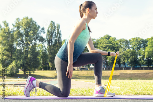 Fototapeta premium Young woman is engaged with fit elastic band on a fitness mat. Exercise to...