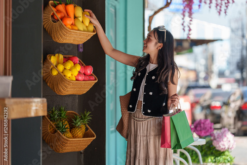 © crizzystudio, Obraz premium Young woman is reaching for a mango at a fruit stand filled with fresh produce displayed in wicker baskets, holding shopping bags in her other hand