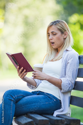 © djoronimo, Obraz premium Young woman is sitting in park and reading book.