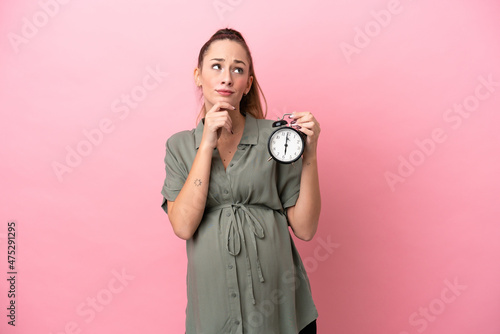 Fototapeta premium Young woman isolated on pink background pregnant and holding clock while thinking