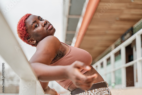 © Oscar, Obraz premium young woman leaning on railing looking at camera