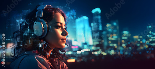 Fototapeta premium Young woman listening to music on headphones double exposure in the city at night