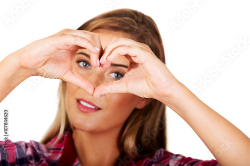 © Piotr Marcinski, Fototapeta premium Young woman making a heart hand gesture