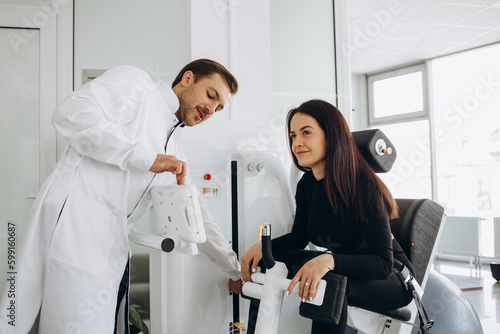 Fototapeta premium Young woman making spine examination in diagnostics machine with physiotherapist