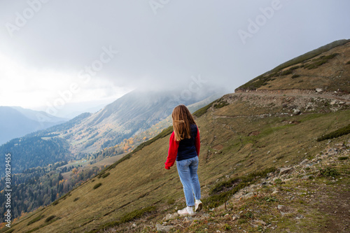 Fototapeta premium Young woman on a mountain hike in Sochi, Russia.