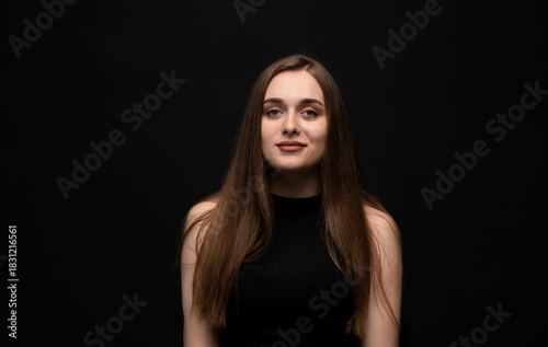 © Volodymyr_sh, Fototapeta premium Young woman on black background with calm confident expression and natural look