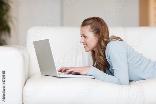 Fototapeta premium Young woman on the sofa typing on her laptop