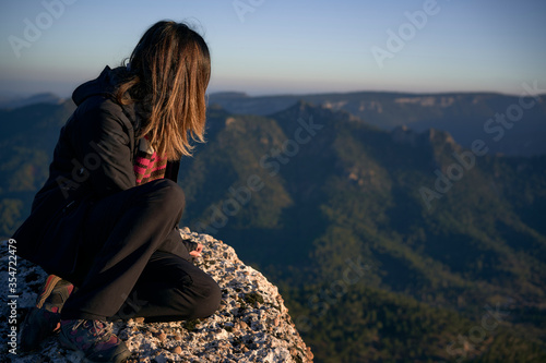 Naklejka premium Young woman on the top of a mountain staring at the horizon. Concept of lifestyle and nature. Long shot.