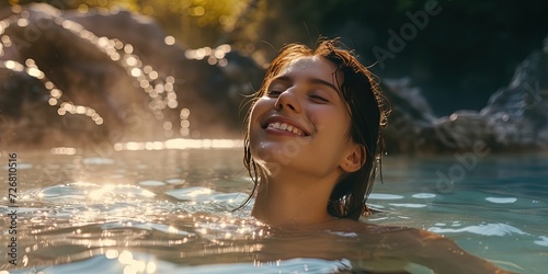 © Brian, Fototapeta premium Young woman on vacation, smiling and relaxing in an outdoor hot springs