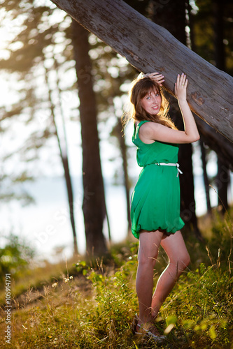 Naklejka premium Young woman outdoor.Stunning sensual outdoor portrait of young stylish fashion woman posing in summer forest