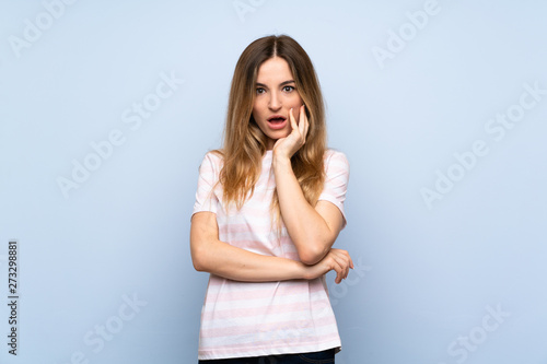 © luismolinero, Fototapeta premium Young woman over isolated blue background surprised and shocked while looking right
