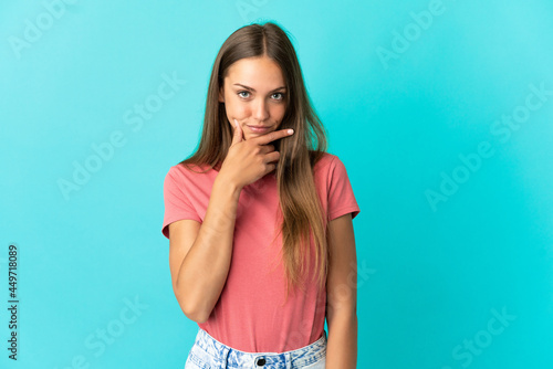 © luismolinero, Fototapeta premium Young woman over isolated blue background thinking