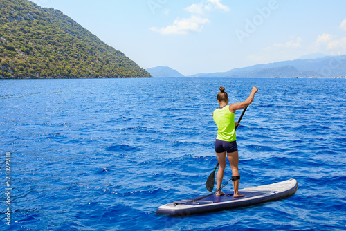 Naklejka premium Young woman paddleboarding on a SUP board in the Mediterranean Sea. Supsurfing, Stand up paddle boarding