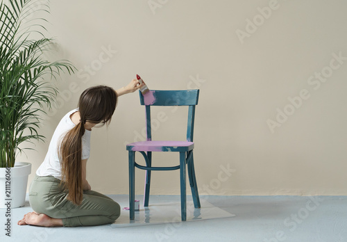 © pauchi, Obraz premium young woman painting chair in pink at home