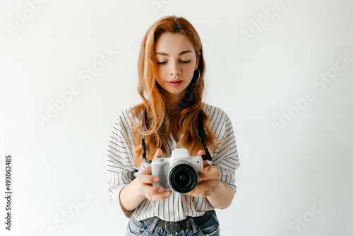 © ChesterAlive91, Fototapeta premium Young woman photographer looking at the live view on her modern camera, woman is enjoying the process