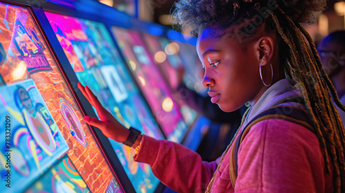 © mikhailberkut, Obraz premium Young Woman Playing Arcade Games in Vibrant Gaming Hall