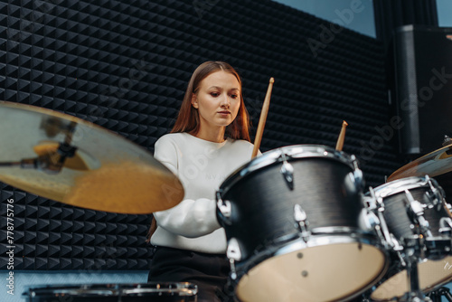 © Anton Pentegov, Fototapeta premium young woman playing drum set