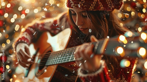 Fototapeta premium Young Woman Playing Guitar in Cozy Christmas Setting with Festive Lights and...