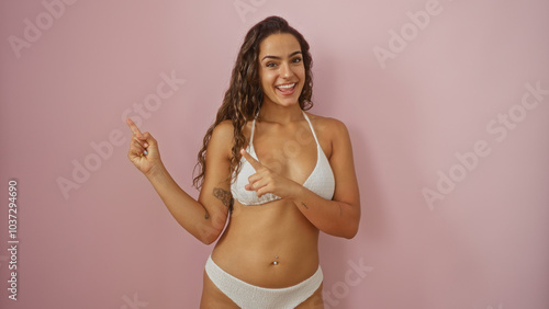 © Krakenimages.com, Naklejka premium Young woman pointing sideways against a pink wall, wearing a white bikini, smiling with a confident expression