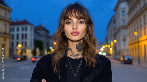 © Oleksandr, Fototapeta premium Young woman portrait with a tattoo on her forearm standing on a city street in the evening.