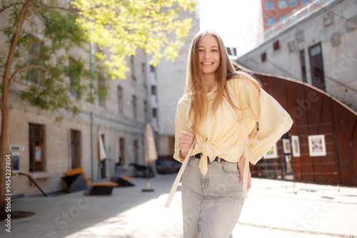 © Sandu, Fototapeta premium Young woman posing happily in a bright urban courtyard on a sunny day