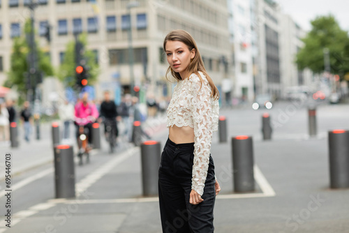 Fototapeta premium young woman posing in lace top and high waist pants standing on street in Berlin in daylight