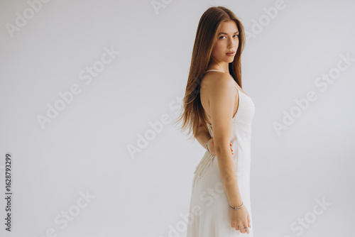 © anatoliycherkas, Obraz premium Young woman posing in white dress with hands behind back