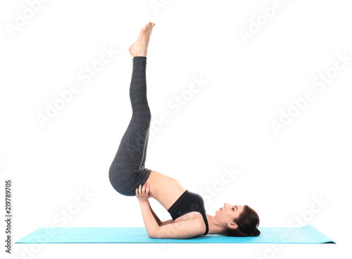 © Pixel-Shot, Fototapeta premium Young woman practicing yoga on white background
