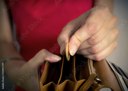 © Irina, Obraz premium Young woman putting a coin in a purse.